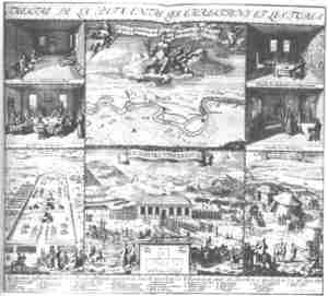 The peace negotiations took place in a camp errected especially for the purpose. The broadsheet's two central fields offer the location with a map of the Danube near Karlowitz and a picture of the wooden house errected for the conference. The division of rooms followed the model of the palace of Rijswick. The Turkish, Imperial, English and Dutch delegations had seperate rooms grouped around the central conference hall. Before the house was erected the conference took place in a camp of tents with the delegates accomodated in tents as dispayed with the Dutch tent of Colyer.[1]
