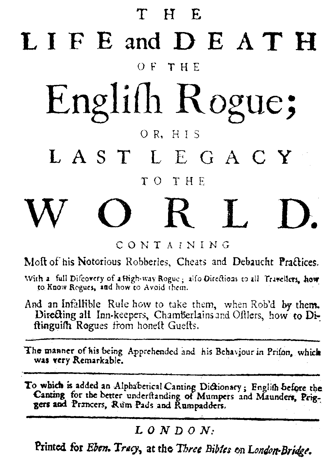 THE| LIFE and DEATH| OF THE| English Rogue;| OR, HIS| LAST LEGACY| TO THE| WORLD.| CONTAINING| Most of his Notorious Roberies, Cheats and Debaucht Practices.| With a full Discovery of a High-way Rogue; also Directions to all| Travellers, how to Know Rogues, and how to avoid them.| And an Infallable Rule how to take them, when Robb'd by them.| Directing all Inn-keepers, Chamberlains and Ostlers, how to Di-|stinguish Rogues from honests Guests.| [rule]| The manner of his being Apprehended and his Behaviour in Prison,| which was very Remarkable| [rule]| To which is added an Alphabetical Canting Dictionary; English before| the Canting for the better understanding of Mumpers and Manders,| Priggers and Prancers, Rum Pads and Rumpadders.| [rule]| LONDON:| Printed by Tho. Norris, at the Looking-Glass on Lon-|don Bridge.