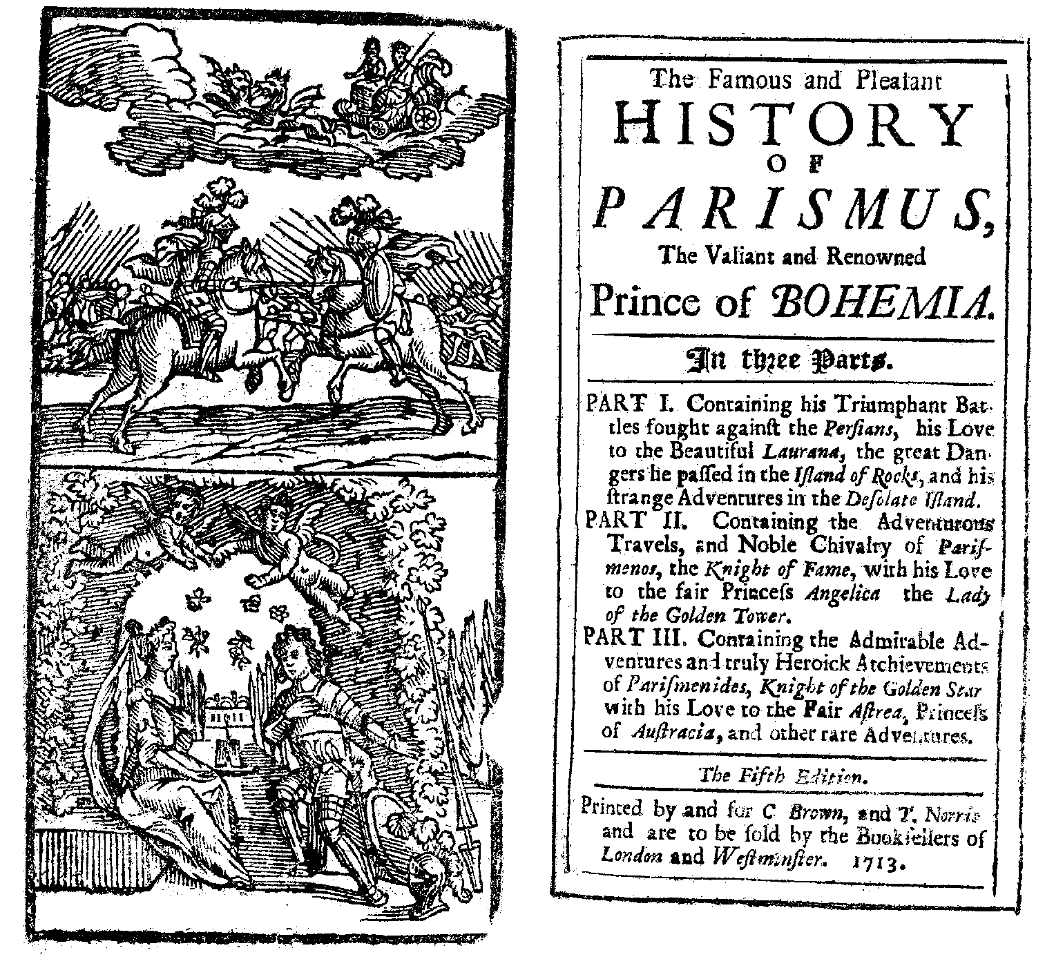 The Famous and Pleasant| HISTORY| OF| PARISMUS,| The Valiant and Renowned| Prince of BOHEMIA.| [rule]| In Three Parts.| [rule]| PART I. Containing his Triumphant Bat-|tles fought against the Persians, his Love| to the Beautiful Laurana, the great Dan-|gers he passed in the Island of Rocks, and his| strange Adventures in the Desolate Island.| PART II. Containing the Adventurous| Travels, and Noble Chivalry of Paris-|menos, the Knight of Fame, with his Love| to the fair Princess Angelica, the Lady| of the Golden Tower.| PART III. Containing the Admirable Ad-|ventures and truly Heroick Atchievements| of Parismenides, Knight of the Golden Star| with his Love to the Fair Astrea, Princess| of Austracia, and other rare Adventures.| [rule]| The Fifth Edition.| Printed by and for C. Brown, and T. Norris| and are to be sold by the Booksellers of| London and Westminster. 1713.