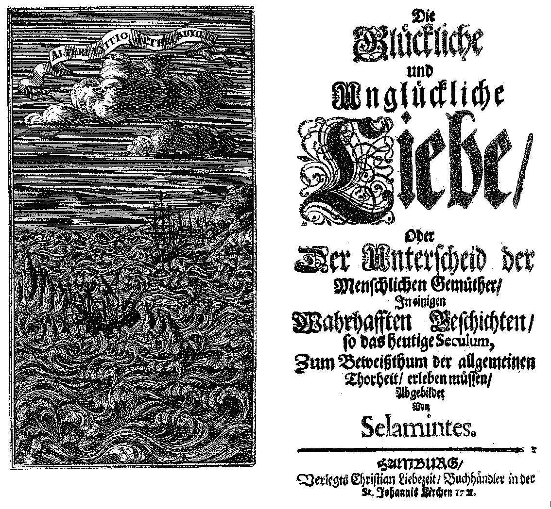 Die| Glückliche| und| Unglückliche| Liebe/| Oder| Der Unterscheid der| Menschlichen Gemüther/| In einigen| Wahrhafften Geschichten/| so das heutige Seculum,| Zum Beweißthum der allgemeinen| Thorheit/ erleben müssen/| Abgebildet| Von| Selamintes.| [rule]| HAMBURG/| Verlegts Christian Liebezeit/ Buchhändler in der| St. Johannis Kirchen 1711.
