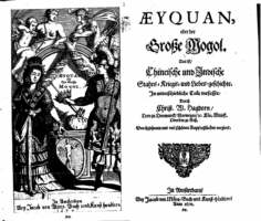 ÆYQUAN,| oder der| Große Mogol.| Das ist,| Chinesische und Indische| Stahts- Kriegs- und Liebes-geschichte.| In unterschiedliche Teile verfasset| Durch| Christ. W. Hagdorn| Dero zu Denmark, Norwegen, &c. Kön. Majest.| Obersten zu Roß| Durchgehents mit viel schönen Kupferstücken verziert.| [publisher's signet]| In Amsterdam,| [rule]| Bey Jacob von Mörs, Buch und Kunst-händlern,| Anno 1670.