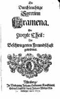 Die| Durchleuchtige| Syrerinn| Aramena.| Der| Zweyte Theil:| Der| Beschwiegerten Freundschaft| gewidmet.| [vignette: Moor's head]| Nürnberg,| In Verlegung Johann Hofmann, Kunsthändl.| Gedruckt daselbst, durch Johann Philipp Mil-|tenberger, Anno 1670.
