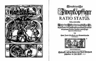 Simplicianischer| Zweyköpffiger| Ratio Status| lustig entworffen| Unter der Histori des waidlichen Kö-|nigs Saul, des sanfftmütigen König Davids,| des getreuen Printzen Jonahtæ und deß tapf-|fern Generalissimi Joabi.| von| Hans Jacob Christoph von Grimmelshausen| Gelnhausano| [vignette: vigilantia et labore]| NÜRNBERG,| [rule]| Gedruckt, und zu finden bey Wolff Eberhard| Felßeckern, im Jahr Christi 1670.
