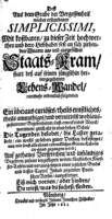 Deß| Aus dem Grabe der Vergessenheit| wieder erstandenen| SIMPLICISSIMI,| Mit kostbaren, zu dieser Zeit hochwer-|then und dero Liebhaber fest an sich ziehen-|den Waaren an uns ausgefüllter| Staats-Kram,| statt des auf seinen jüngsthin her-|vorgegebenen Lebens-Wandel, nun mehr ordentlich folgenden| Dritten und letzten Theils| Ein überaus curiöses, theils ernstliches,| theils anmuthiges, und vermittels wohlaus-|gesonnener Begebenheiten, Lust-erweckendes Werck,| worinnen gleich als in einer hohen Schul,| Die Tugenden belobet, die Laster geta-|delt ein wohl zu leben guter Vorsatz befestiget,| und mit sonst allerhand erdencklichen Sitten-Lehren| an hand gegangen wird;| Auf gethanes Versprechen, und inständiges| Begehren zusamt| beygefügten netten, künstlichen Kupf-|fer Tafeln, und vorausgesetzten eines jeglichen Buchs| und dessen Capitel Inhalt zeigenden Poeti-|schen Versen ausgefertiget.| Liß mich vornen, oder hinden| Du wirst, was du suchest, finden| [rule]| Nürnberg,| Druckts und verlegts Johann Jonathan Felßecker,| Im Jahr 1684.![]() |