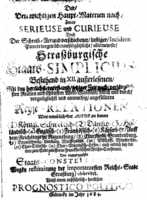 Der,| Den wichtigen Haupt-Materien nach,| Zwar| SERIEUSE und CURIEUSE| Doch| Der Schreib-Art und verschiedener, lustiger, Incident-|Puncte wegen überaußergötzliche, allerneueste,| Straßburgische| STAATS-SIMPLICIUS| Bestehend in XII. außerlesenen,| Mit den herzlichst-rarest-und, jetziger Zeit nach, verlänglich-|sten Realien und schönsten Welt-Materien, durch und durch,| vergnüglichst und anmuthig, angefülleten| Reyse-RELATIONEN| Was nemblich der AUTOR an denen| (1) Königl. Schwedisch- (2) Dänisch- (3) Hol-|ländisch- (4) Englisch- (5) Frantzösisch- (6) Käyserl- (7) Auff| dem Reichstage zu Regensburg, (8) Churfürstl. Brandenburg.| (9) Braunschweig. Lüneburg. Wolffenbüttl. (10) Bischöffl. Münsterische.| (11) Chur-Cölnisch- (12) Chur-Mäyntzisch-Höfen, auch endlich bey der| eben zum Ende geloffenen Franckfurtischen Reichs-Conference.| Vor remarquable| Staats-CONSTELLATIONES| Wegen restituirung der importantesten Reichs-Stadt| Straßburg, observiret.| Nebst einem außführlich-herzlichen| PROGNOSTICO POLITICO.| [rule]| Gedruckt im Jahr 1684.![]() |