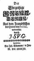 Die| Ehrgeitzige| GRENA-|DERIN,| Aus dem Französischen| des Herrn von Prechac,| verdeutschet| durch| J.S.V.G.| [line of typographical ornaments]| Zu finden| Bey Joh. Schumann in Zeitz.| M. DC. LXXXIV.![]() |