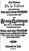 Der Madam| De la Valliere| Merckwürdige| Lieb- und Lebens-Geschicht,| so sich zwischen Ihr| und| Konig Ludwigen| den XIV. in Franckreich| eigentlich zugetragen.| Kurtz, und ohne Weitläuff-|tigkeit, doch außführlich beschrie-|ben, samt allen darbey vorge-|henden Begebenheiten| [vignette]| Gedruckt im Jahr 1684.![]() |