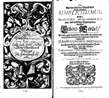 Der| Aus dem Grab der Vergessenheit| wieder erstandene| Simplicissimus;| Dessen| Abentheurlicher und mit allerhand seltsa-|men, fast unerhörten Begebenheiten| angefüllter| Lebens-Wandel| auf eine gantz ungemeine, weit besser als vorhin neu-| eingerichtete, zierlichere und anmuthigere Schreib-Art,| vermittelst| Scharffsinnigen Lehren, wohlkommen-|den Anmerckungen und schonklingenden Poeti-|schen Versen, auch recht lebhaften| Kupffer-Bildnüssen;| Lust-liebenden, und curieusen Gemüthern| auf das annehmlichste, zu verhoffentlich sattsamer| Befriedigung, auf- und vorgestellet wird,| Durch| Germann Schleiffheim von Sultzfort.| Dem es wollen so behagen,| Lachend, was mehr ist, zu sagen.| [vignette]| Nürnberg,| Druckts und verlegts Johann Jonathan Felßecker,| 1684.![]() |