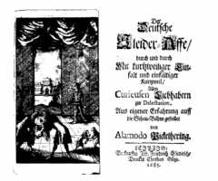 Der| Deutsche| Kleider-Affe,| durch und durch| Mit kurtzweiliger Ein-|falt und einfältiger| Kurtzweil,| Allen| Curieusen Liebhabern| zur Delectation,| Aus eigener Erfahrung auff| die Schau-Bühne gestellet| von| Alamodo Pickelhering.| [rule]| LEIPZIG,| Verkauffts Joh. Friedrich Gleditsch,| Druckts Christian Götze.| 1685.![]() |