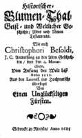 Historischer-|Blumen-Thal,| Geist- und Weltlicher Ge-|schichte, Altes und Neuen| Testaments.| Wie auch| Christophori Besoldi,| J. C. Anweisung zu den Alten Geschich-|ten, von den 4. Monar-|chien.| Von Anfang der Welt biß| Anno 1619.| Aus den Lateinis. ins Hochteutsche| übersetzet| Von| Einen Unglückseligen| Fürsten.| [vignette]| Gedruckt zu Rinteln, 1685![]() |