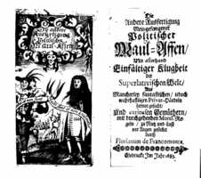 Die| Andere Ausfertigung| Neu-gefangener| Politischer| Maul-Affen,| mit allerhand| Einfältiger Klugheit| der| Superlativischen Welt,| Aus| Mancherley fantastischen, iedoch| wahrhafftigen Privat-Händeln| hervor gesucht,| Und curieusen Gemüthern,| mit durchgehenden Moral-Re-|geln, zu Nutz und Lust| vor Augen gestellet| durch| Florianum de Francomonte,| [line of typographical elements]| Gedruckt Im Jahr 1689.![]() |