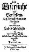 Die| Eifersucht| der| Verliebten,| nach ihren Fehlern und| Vortheilen,| In| einer anmuthigen| Liebes-Geschichte| der| curieusen Welt| zu sonderbarer Gemüths-Ergözung| vorgestellet| Von| Talandern| [rule]| In Verlegung Friedr. Lanckischens| Erben. 1689.![]() |