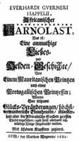 EVERHARDI GUERNERI| HAPPELII,| Africanischer| TARNOLAST,| Das ist:| Eine anmuthige| Liebes-| und| Helden-Geschichte,| Von| Einem Mauritanischen Printzen| und einer| Portugallischen Printzessin;| Worinn| Gar seltzame| Glücks-Veränderungen, höchst-|verwunderliche Ebentheuren, insonder-|heit aber die Africanische Sachen grossen| Theils angeführet, auch sonst allerhand leß-|würdige Dinge fürgebracht werden.| Mit schönen Kupffern gezieret.| [rule]| ULM, bey Matthæo Wagnern, 1689.![]() |
