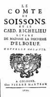 LE| COMTE| DE| SOISSONS.| ET LE| CARD. RICHELIEU| RIVAUX| DE MADAME LA DUCHESSE| D'ELBOEUF.| NOVVELLE GALANTE.| [vignette]| A COLOGNE,| Chez PIERRE MARTEAU.| [rule]| 1690.![]() |