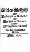 Liebes-Geschicht| Des| Cardinals von Richelieu| und| Grafens von Soissons| Mit der| Hertzogin von Elboeuf.| Aus dem Frantzösischen| übersetzt.| [rule]| Cölln, 1690.![]() |