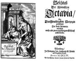 Beschluß| Der Römischen| Octavia,| Der| Durchleuchtigsten Herzogin| gewidmet,| Die diese Römerin| von ihrem| mehr als zwanzigjährigem Schlaff| aufferwecket. | [vignette]| Nürnberg,| In Verlegung Joh. Hoffmanns S. Wittib,| und Engelbert Streck.| ANNO M DCCIV.| Christian-Erlang, Druckts Johann Fridrich Regelein.![]() |