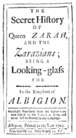 The Second Part, or a Continuation of THE| Secret History,| OF| Queen ZARAH,| AND THE| Zarazians [...] 1705.