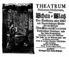THEATRUM| Malorum Mulierum,| Oder| Schau-Platz| Der Bosheiten aller bösen| und Regier-süchtigen Weiber| über ihre Männer,| Von Eva an biß Socrates| Entsprossener Xantippe, und| ihre bösen Nachfolgerin.| Treufleißig colleg. und beschrieben,| Im Jahr, da die Männer gut, und| die Weiber waren böse.| Nebst etl. wenigen Recepten, böse Weiber| gut zu machen.| Von dem, der die Wahrheit| Fein Rein Schreibet.| [rule]| Hunßfeld,| Verlegts Carl Kalte-Schahl.![]() |