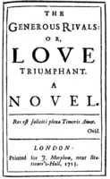 THE| GENEROUS RIVALS:| OR| LOVE| TRIUMPHANT.| A| NOVEL.| [rule]| Res est soliciti plena Timoris Amor.| Ovid.| [rule]| LONDON:| Printed for J. Morphew, near Sta-|tioner's-Hall, 1713.![]() |