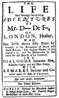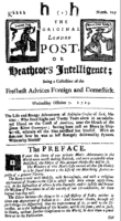 Kkkkkk (1) Numb. 125| [between two cuts, left: seller of newspapers calling »London Post«, right: seller of newspapers calling »News from Spain«:] THE| ORIGINAL| LONDON| POST,| OR| [whole page:] Heathcot's Intelligence;| Being a Collection of the| Freshest Advices Foreign and Domestick.| [rule]| Wednesday October 7. 1719.| [rule]| The Life and strange Adventures of Robinson Crusoe, of York, Ma-|riner: Who lived Eight and Twenty Years, alone in an uninha-|bited Island on the Coast of America, near the Mouth of the| Great River of Oroonoque; having been cast on Shore by Ship-|wreck, wherein all the Men perished but himself. With an| Account how he was at last as strangely delivered by Pyrates.| Written by himself.| [rule]| The PREFACE.| IF ever the Story [...] |