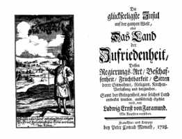 Die| glückseeligste Insul| auf der gantzen Welt,| oder| Das Land| der| Zufriedenheit,| Dessen| Regierungs-Art, Beschaf-|fenheit, Fruchtbarkeit, Sitten| derer Einwohner, Religion, Kirchen-|Verfassung und dergleichen,| Samt der Gelegenheit, wie solches Land| entdecket worden, ausführlich erzehlet| wird, von| Ludwig Ernst von Faramund.| Mit Kupfern versehen.| [double rule]| Frackfurt und Leipzig,| bey Peter Conrad Monath, 1728.![]() |